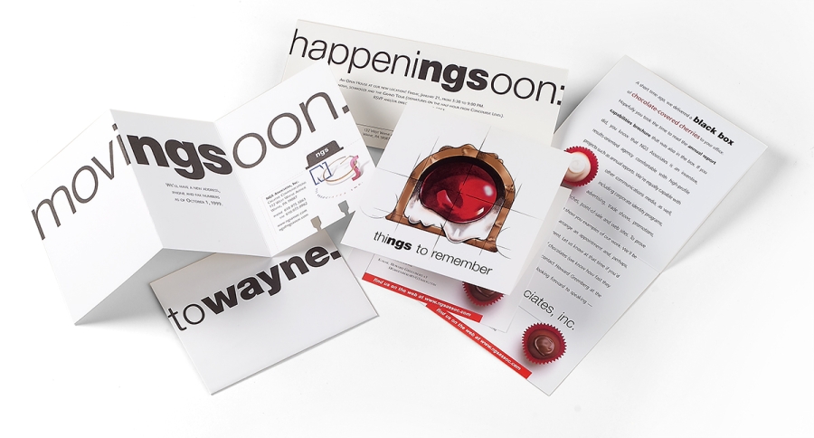 The follow-up pieces used wordplay to inform clients of NGS' move to Wayne, PA (“movingsoon”) and to invite clients to an open house (“happeningsoon”).